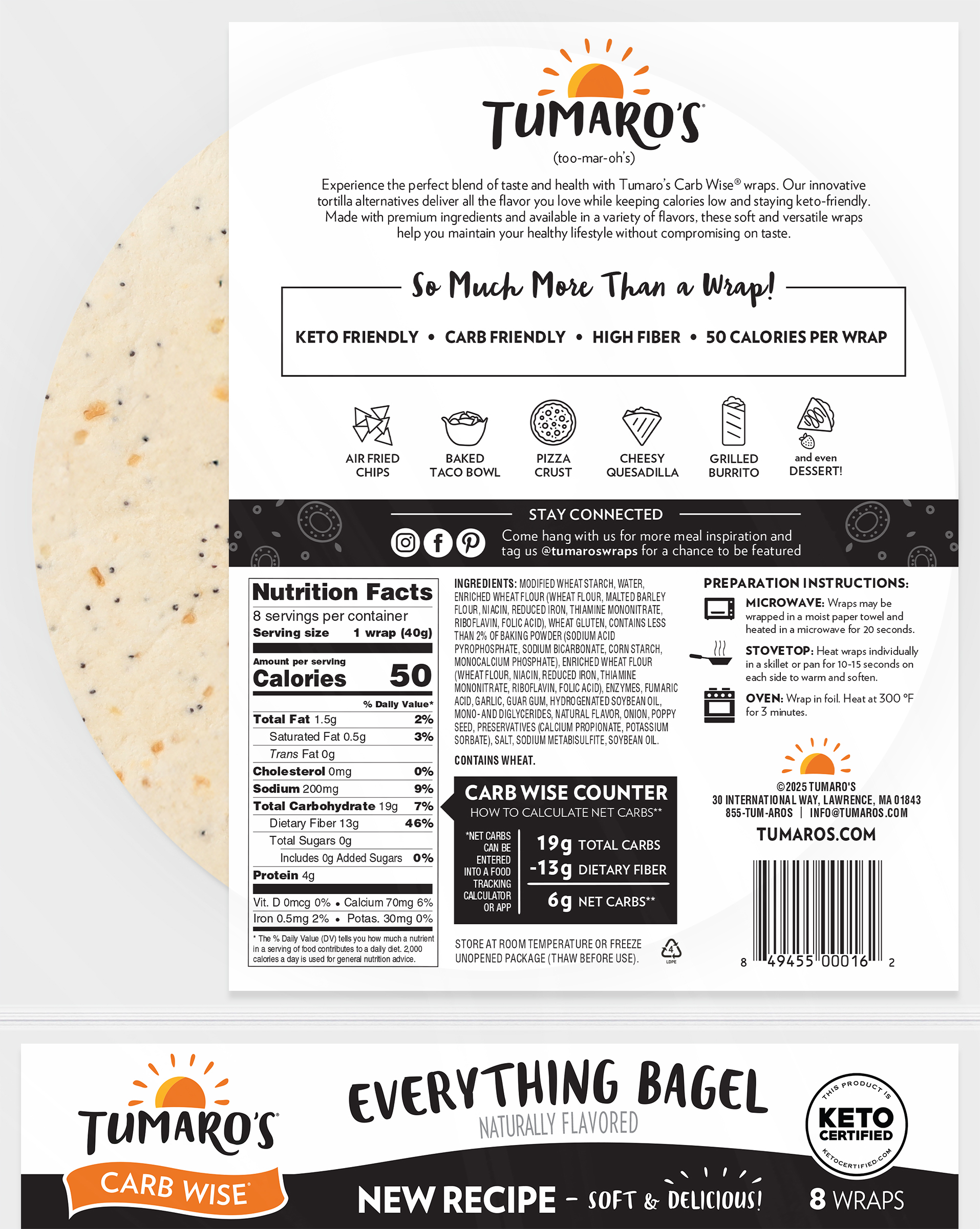 Whether you’re counting macros, points or calories, you can count on our Everything Bagel Carb Wise™ wraps to satisfy your cravings for something savory! So much more than a wrap, our Everything Bagel variety delivers on versatility – great for making burritos, pizza and more. Plus, each wrap only has 5 net carbs and 50 calories.