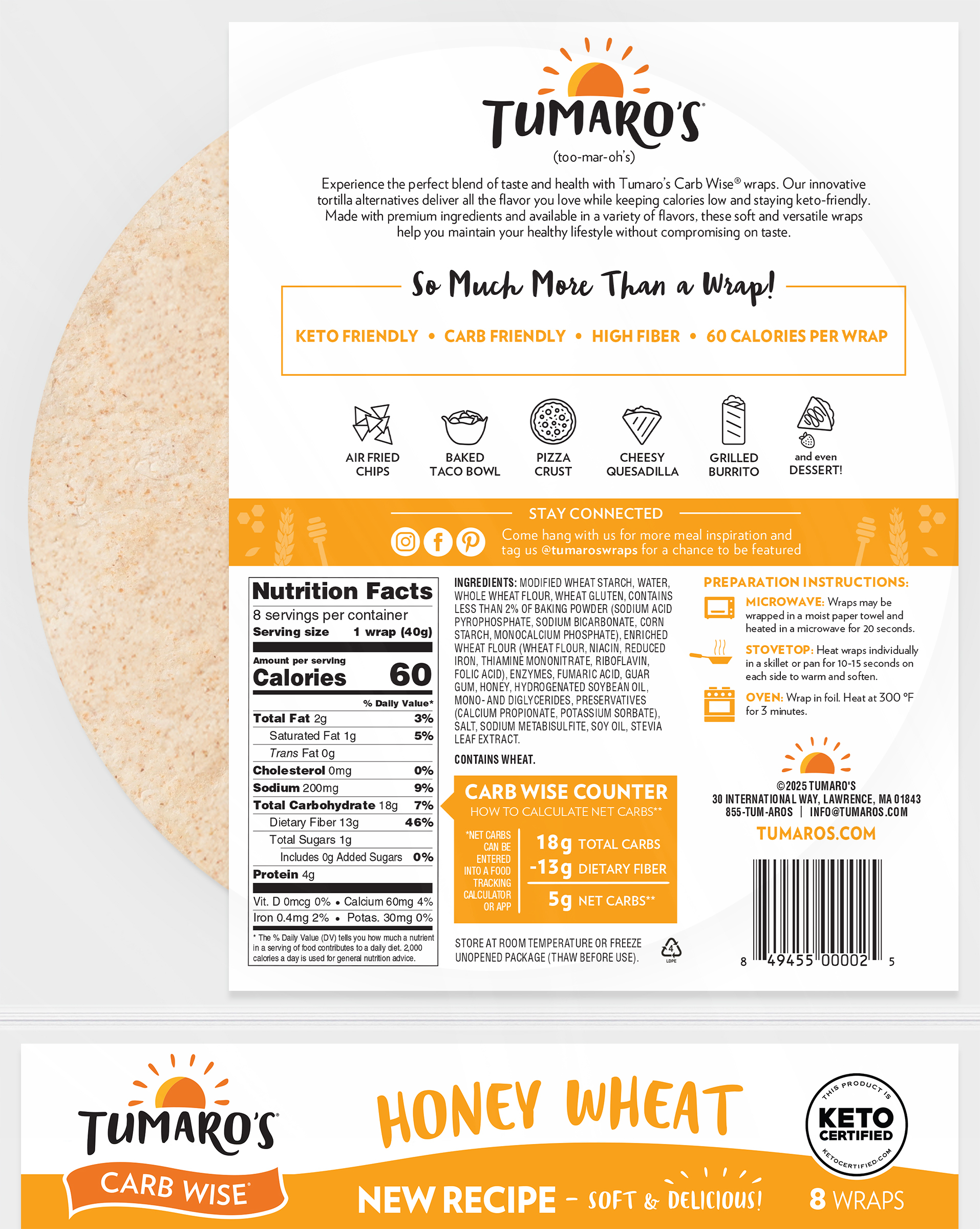 No matter what you’re counting, you can count on our Honey Wheat Carb Wise™ wraps to add a savory yet sweet flavor to your meal all while being carb-friendly. Each wrap only has 5 net carbs and 60 calories. These wraps have wholesome grains and 13g of fiber per serving – perfect for any lifestyle!