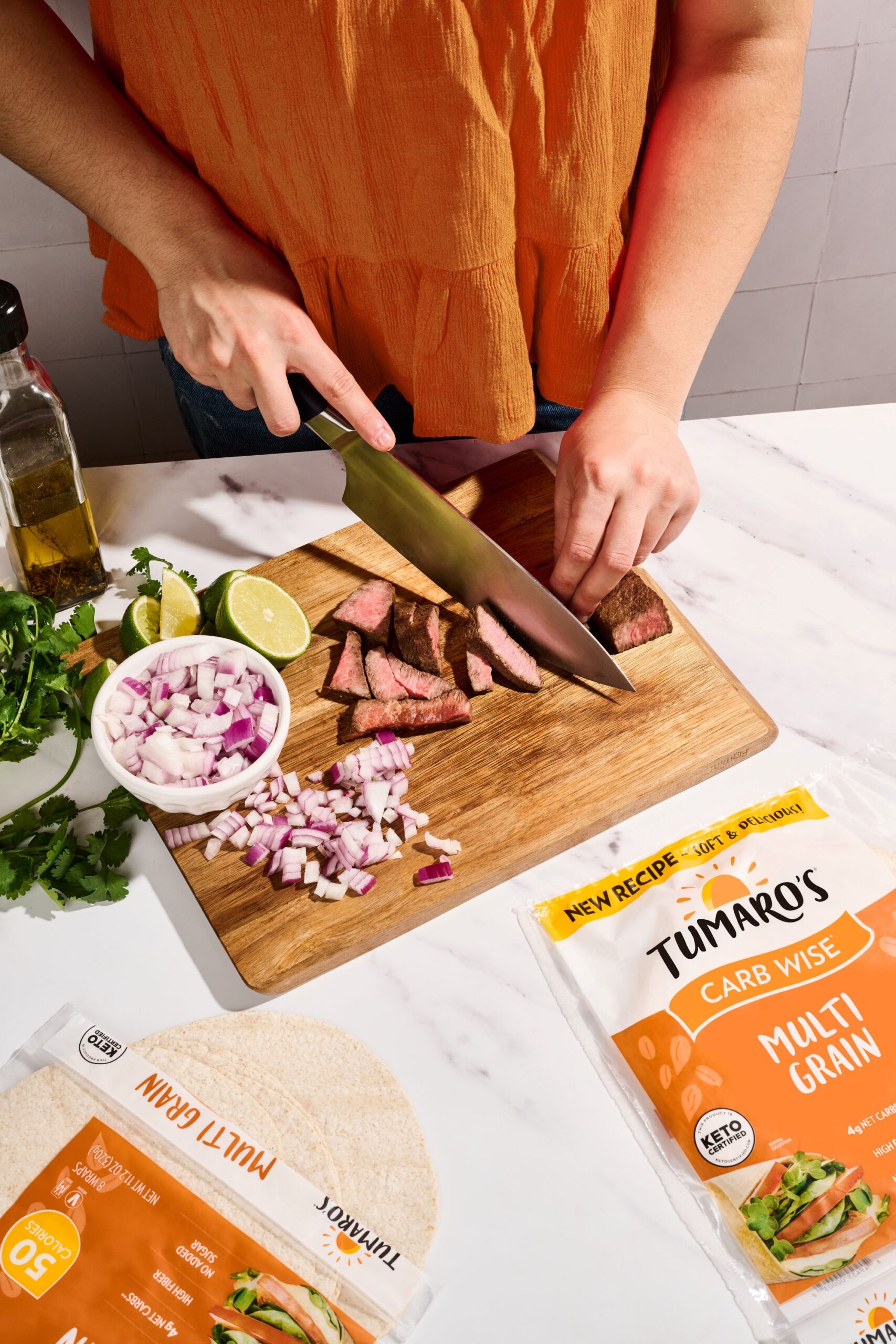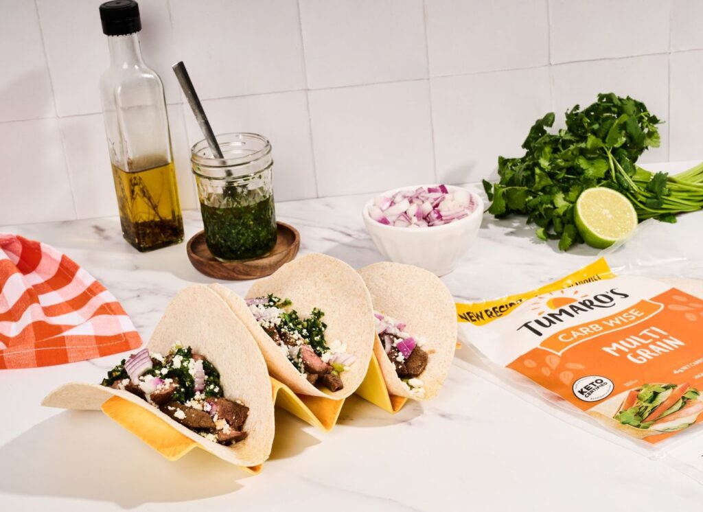 Chimichurri steak tacos made with tender sliced steak, fresh herbs, and bright lime in a soft Tumaro’s Multi Grain Carb Wise Wraps. Easy, fresh, and ready in 25 minutes.
